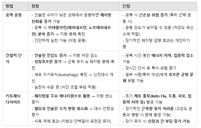 이 세 가지 전략은 모두 지방 연소를 촉진하는 데 효과적이지만, 개인의 목표, 생활 패턴, 신체 상태에 따라 적절한 방법을 선택하는 것이 중요하다.