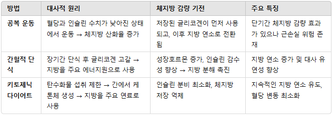 각 방법의 생리학적 원리를 이해하고, 자신에게 맞는 전략을 선택하는 것이 지속 가능한 체지방 감량과 건강한 다이어트를 위한 핵심이다.